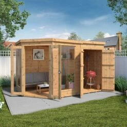 The Mercia 11’ x 7’ – Corner Summerhouse with Side Shed is not only a lovely place to relax in the garden, it also includes a fantastic storage facility, which makes for the ultimate all-in-one garden building. What’s more, this versatile log cabin is completely constructed from premium materials and comes with an excellent 10-year warranty.