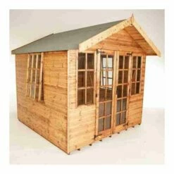 - Summerhouse includes veranda and glazed, bi-fold double doors with key-operated lock