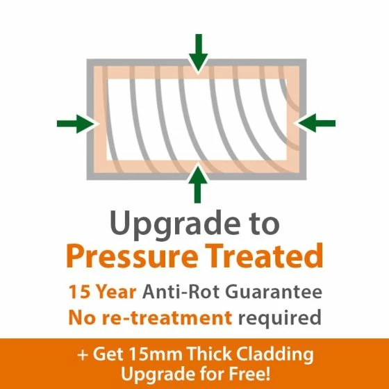 - Upgrade to pressure-treated for 15-year guarantee and FREE 15mm cladding upgrade