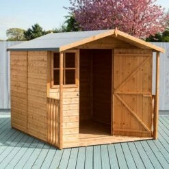 This 8×8 summerhouse is supplied dip treated with a 10-year anti-rot guarantee, when supported with annual retreatment. An upgrade to a top coat is available for this garden building. This top coat is a wood stain that provides a waterproof coating to resist algal and fungal attack. It nourishes the wood to provide year-round colour and protection. Two coats are applied, by the manufacturer, to both the interior and exterior of the building. As a dip-treated summer house, it is usually recommended that the customer apply a treatment upon assembly; this top coat eliminates the need to do so. The colour of this stain is called “gold” which is an orangey-yellow.