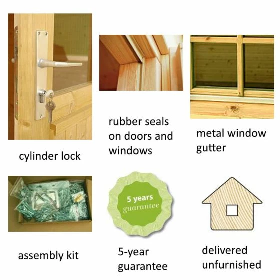 This garden building is backed by a 5-year parts guarantee and includes an assembly kit. As the wall panels are readymade, assembly is simple.
